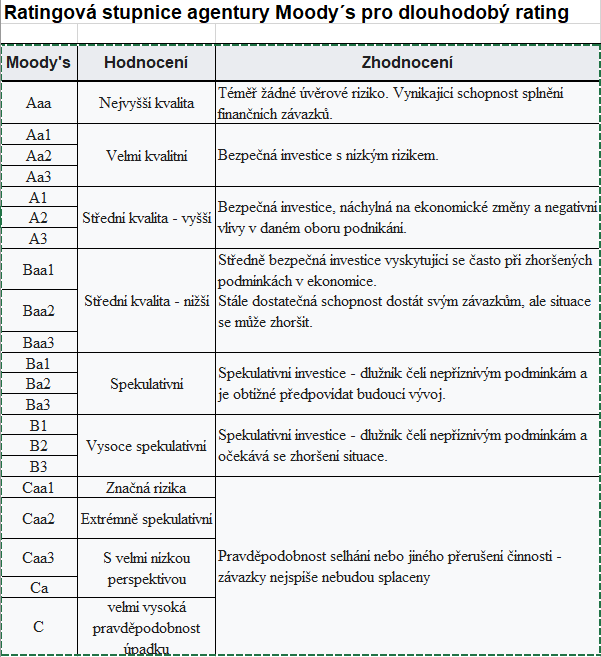 V tabulce je uvedena celá hodnotící škála, kterou agentura Moody’s používá. Význam městem získané ratingové známky Aa3 jako čtvrté nejvyšší na škále 21 možných stupňů hodnocení je zřejmý.