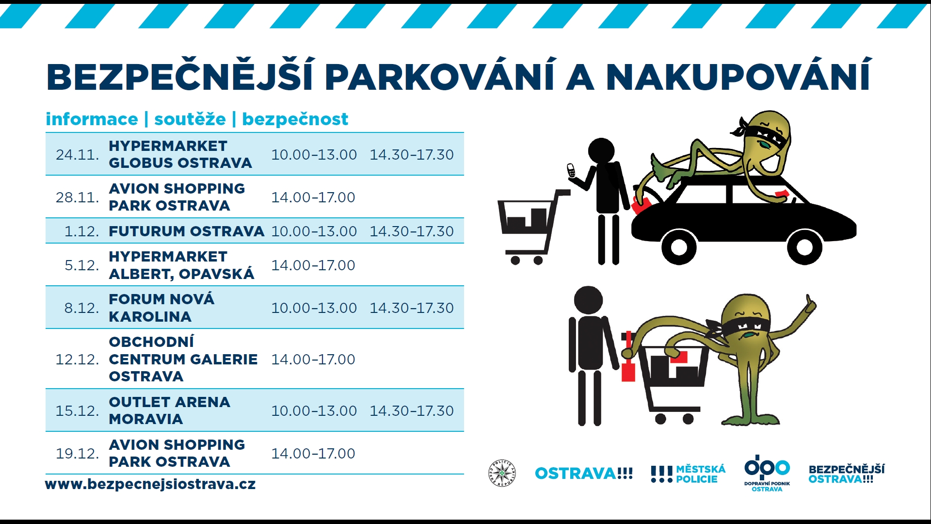 V rámci projektu Bezpečnější Ostrava budou před Vánocemi probíhat informační akce Bezpečnější nakupování a parkování. Na akcích budou spolupracovat obchodní centra, příslušníci Policie ČR Ostrava, strážníci Městské policie Ostrava, Asistenti prevence kriminality, absolventi projektu Senior – posel prevence a Magistrát města Ostravy.