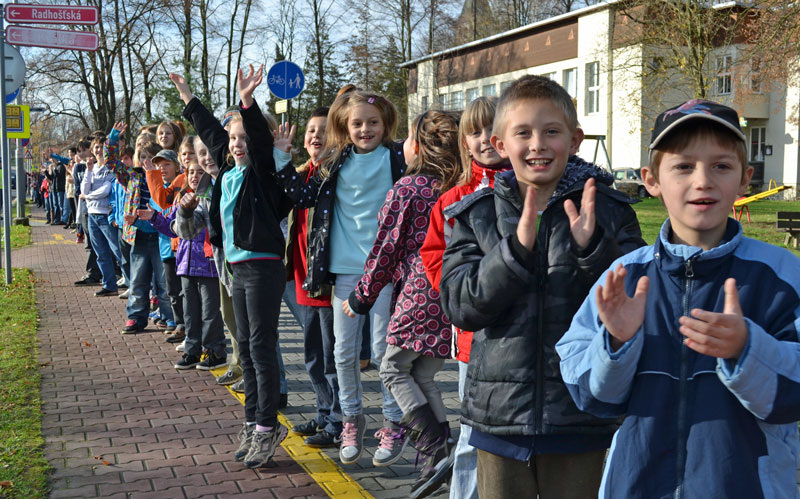 Děti ze ZŠ Bílovecká Svinov vítají běžce.