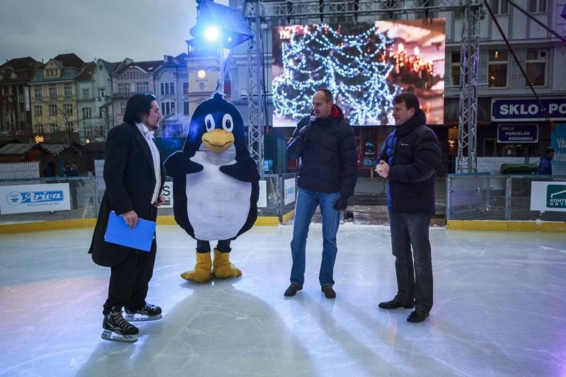 Kluziště otevřeli (zprava) L. Palyza, J. Kovář, tučňák Rudolf a V. Polák.