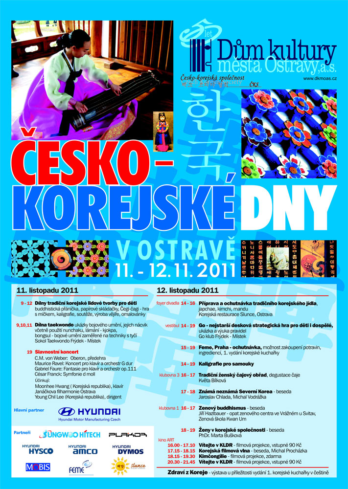 Dům kultury města Ostravy představí ve dnech 11. a 12. listopadu ostravské veřejnosti tradiční i současnou korejskou kulturu. Ve spolupráci s Česko - korejskou společností a pod záštitou velvyslance Korejské republiky J. E. Gabriela Oh připravil „Česko – korejské dny v Ostravě 2011“. Hlavní částí dvoudenního programu bude páteční Slavnostní koncert.