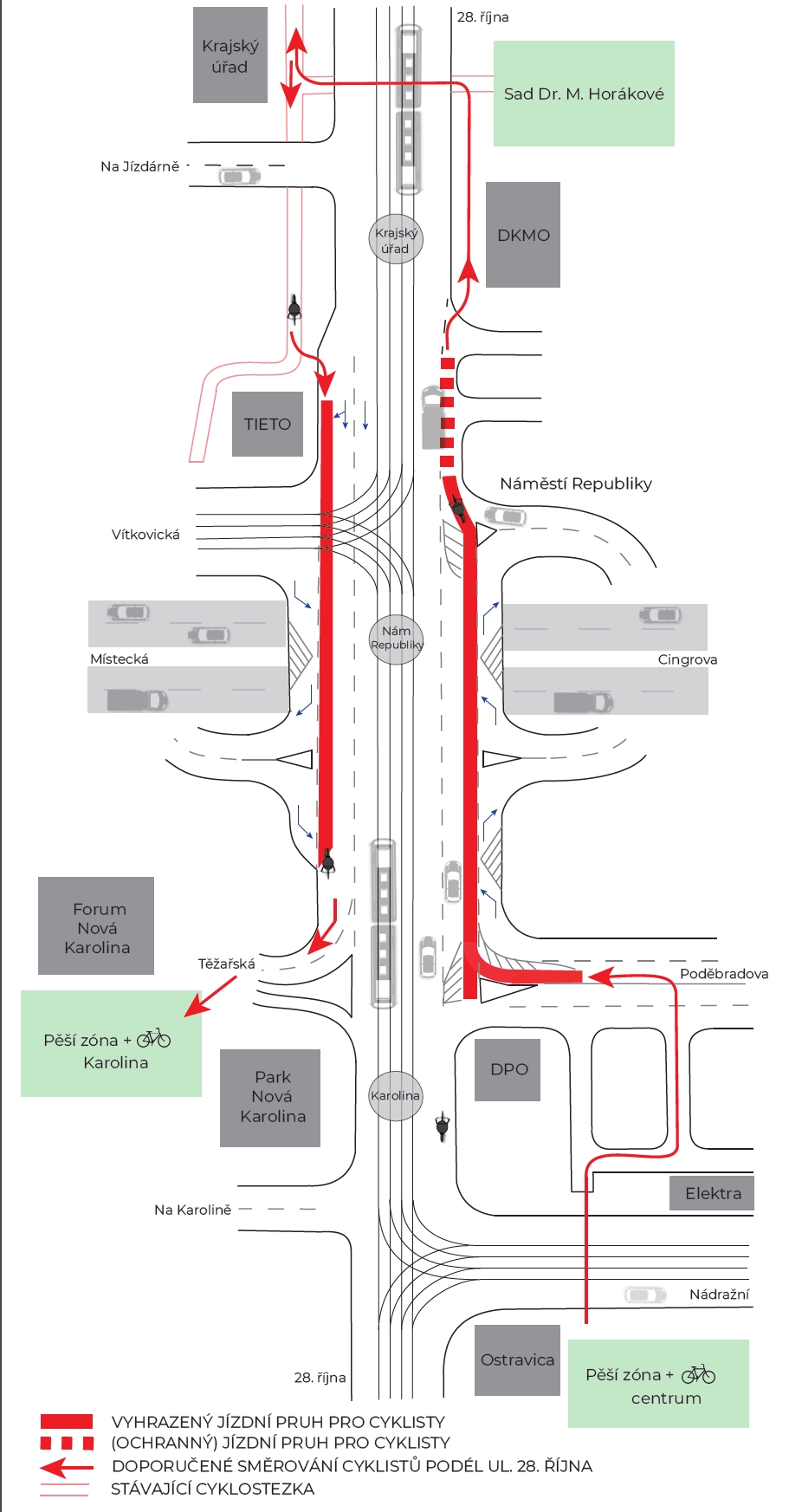 Městská třída 28. října – Opavská je jednou z nejvýznamnějších tepen v Ostravě, představuje přímé spojení z Moravské Ostravy do Poruby, je dlouhá 12 km. V jejím okolí žije 100 tisíc lidí, kteří na ní tráví čas a pohybují se po ní pěšky, autem, v MHD nebo na kolech. Aktuální opatření je jednou z dílčích etap projektu pro zkvalitnění městské třída 28. října – Opavská a reakcí na dlouhodobý požadavek obyvatel Ostravy na přímé a bezpečnější cyklistické spojení městských částí.