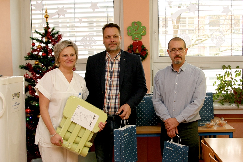 Jana Šadibolová je ráda i za stoličky pro dětské oddělení. Uprostřed Michal Mariánek, vpravo Petr Uhlig.