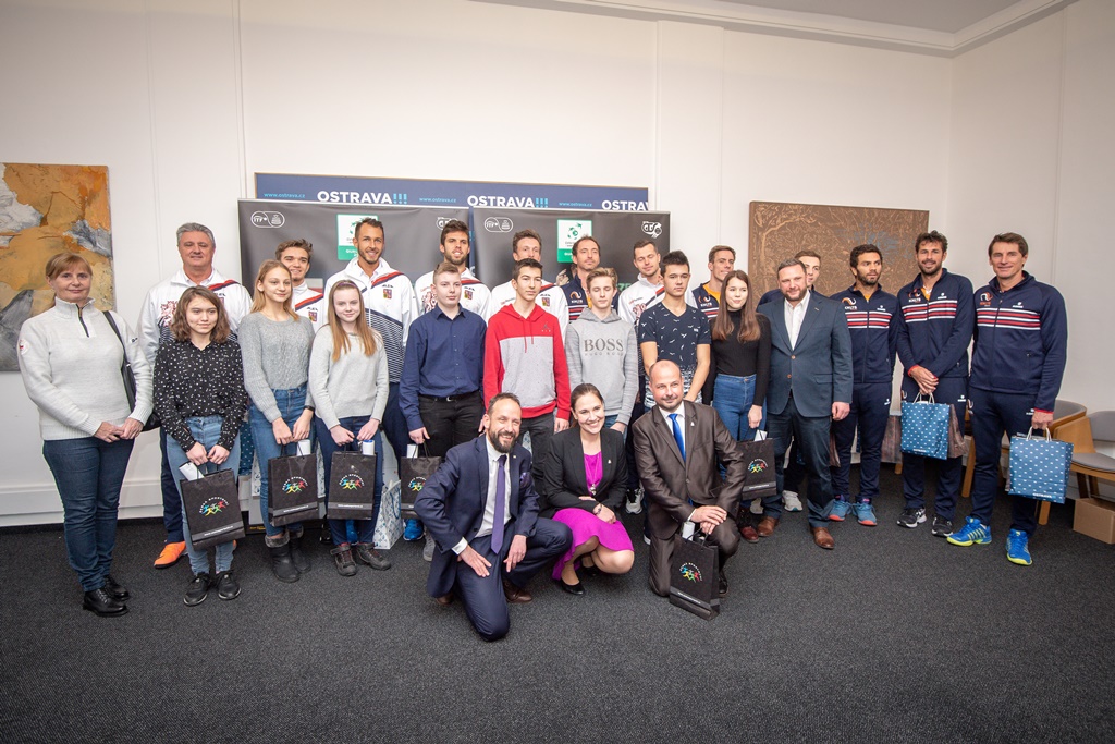 Tenisté obou týmů se společně s primátorem Tomášem Macurou, náměstkyní Andreou Hoffmannovou a krajským náměstkem Lukášem Curylem vyfotili s žáky sportovní základní školy B. Dvorského.