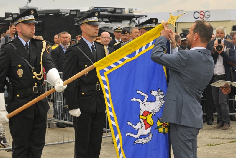 Primátor T. Macura dekoruje prapor městské policie čestnou stuhou.