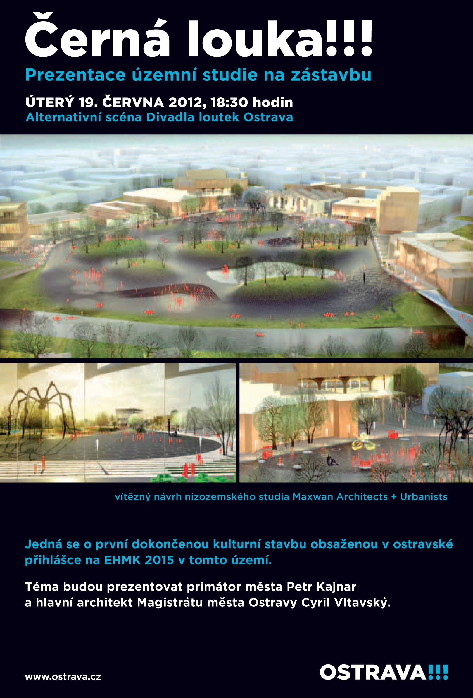 Útvar hlavního architekta města Ostravy dokončil práci na územní studii Černé louky, do níž zapracoval vítězné řešení ideové urbanistické soutěže s mezinárodní účastí o návrh revitalizace a rozvoje této lokality. Vítězem soutěže z roku 2010 se stal nizozemský ateliér Maxwan. Dokončenou studii představí město Ostrava veřejnosti v úterý 19. června od 18.30 hodin v Alternativní scéně Divadla loutek Ostrava. Téma budou prezentovat primátor města Petr Kajnar a hlavní architekt města Ostravy Cyril Vltavský.