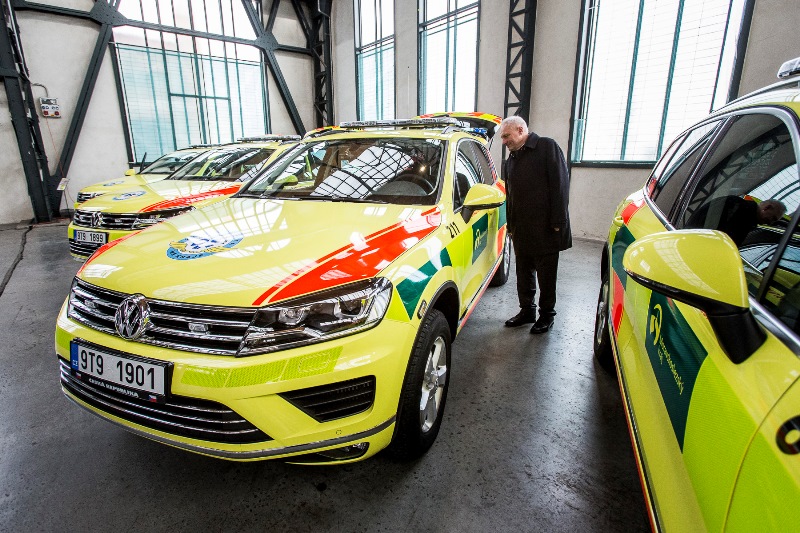 Náměstek primátora Zbyněk Pražák si prohlíží nové sanitní vozy.
