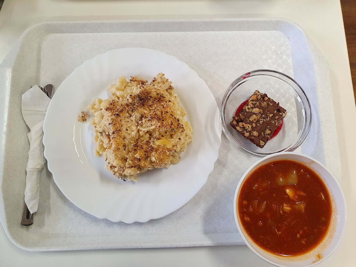 Tentokrát připravil známý šéfkuchař s kuchařkami ostravské školní jídelny neobvyklé menu, sestávající z polévky halászlé, hlavního chodu s názvem mac and cheese s květákovým kuskusem, doplněného moučníkem, čokoládovým brownie s karamelizovanými vlašskými ořechy a slaným karamelem. A stejně jako v předchozích školách, kde mentoringy již proběhly, děti i dospělí připravené pokrmy hodnotily velmi pochvalně.