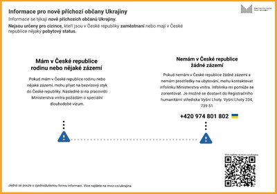 - Nově příchozí Ukrajinci mohou do ČR vstoupit v rámci bezvízového styku, nepotřebují tedy po dobu 3 měsíců k pobytu žádné vízum. Nicméně předpokládáme, že se budou chtít zapojit do běžného života a začít pracovat, i oni tedy mohou požádat o speciální dlouhodobé vízum. Mnoho z těch, co nově přijíždí, má v ČR nějaké zázemí – rodinu, kamarády, takže část z nich nebudou potřebovat žádnou asistenci. Tito cizinci musí splnit svou registrační povinnost na Policii.