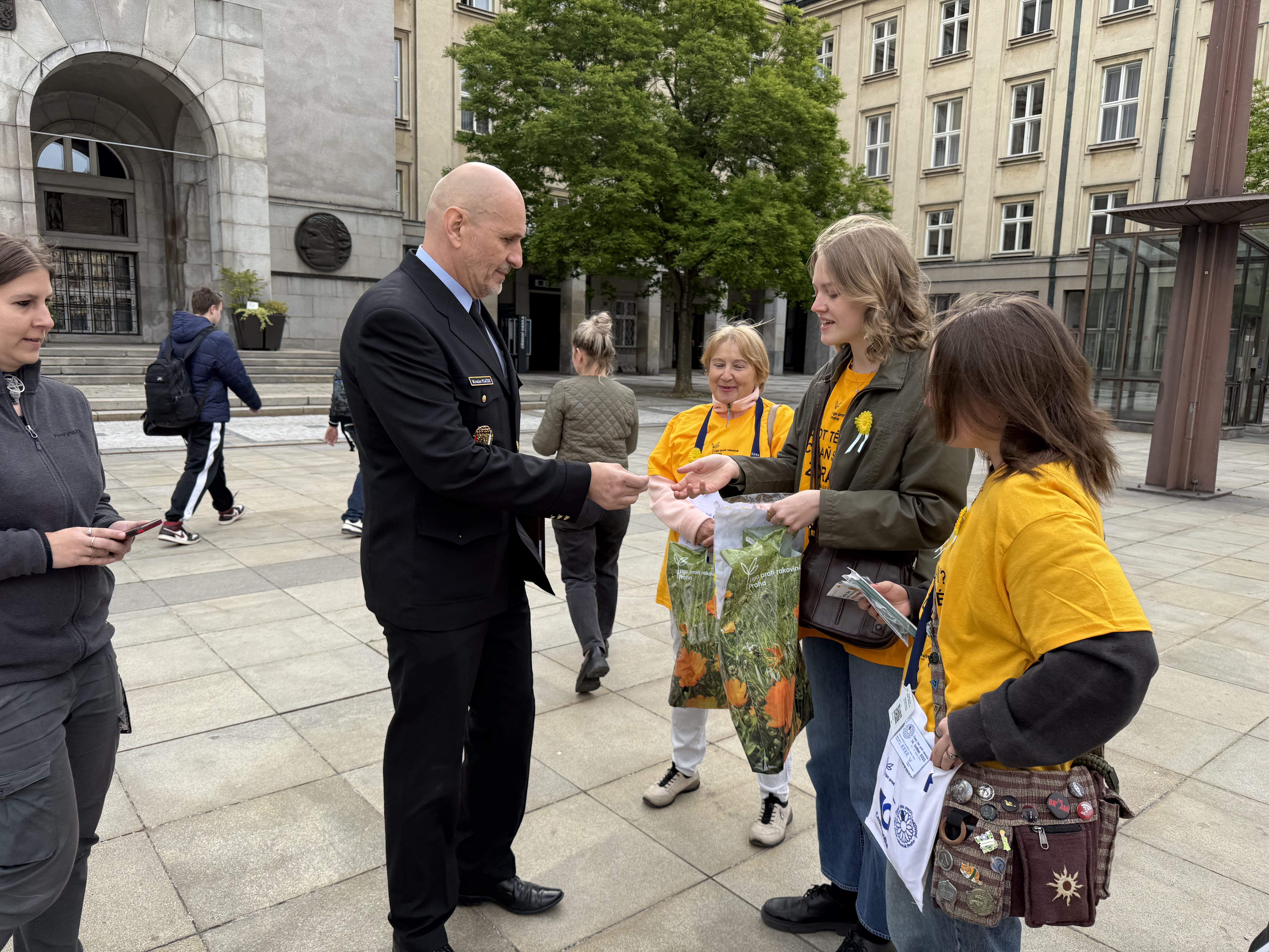Dobrovolnice v akci. Zde prodávají kvítek řediteli ostravských strážníků Miroslavu Plačkovi