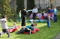 Na zahradě společnosti SPOLEČNĚ – JEKHETANE si děti z vyloučených lokalit mohou hrát a současně se připravovat na školku nebo školu. Foto: Bohuslav Krzyžanek
