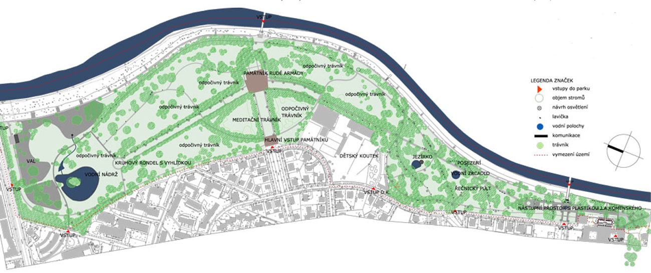 Území začíná na jihu bustou Komenského a končí severním koncem čtyřřadé aleje u tenisových kurtů. Území je děleno centrální promenádou na dvě nestejné části. Východní, užší, je výrazně orientována k řece a oplývá zajímavými výhledy na řeku a nábřeží. Druhá část je zřetelně ovlivněna charakterem ulice Sadové a jejími vilami, nachází se zde terénní val – stopa po dávno zrušeném parkovém altánu a severně končí ve stínu stromů u zaoblené zdi z bílých cihel, za níž je oddělený areál dětského koutku. Střední část parku by měla být tvořena loukami, kde by zeleň tvořila příjemné, různě velké plochy lákající k posezení nebo poležení v trávě. Čtyřřadá lipová alej není součástí řešeného území, předpokládáme navázání na stávající stav. V této části parku byl navržen Řečnický pult, který měl sloužit i pro autorské čtení, předčítání pohádek dětem a podobné aktivity, na základě veřejné ankety byl zrušen.