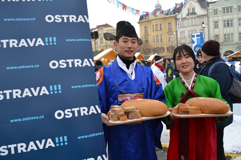 Korejští hosté nabízeli český olympijský chléb Karel.