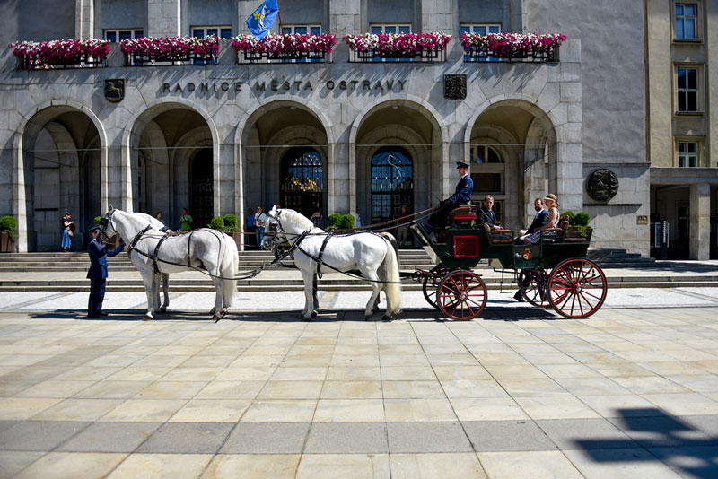Čtyřspřeží kladrubských koní před Novou radnicí.