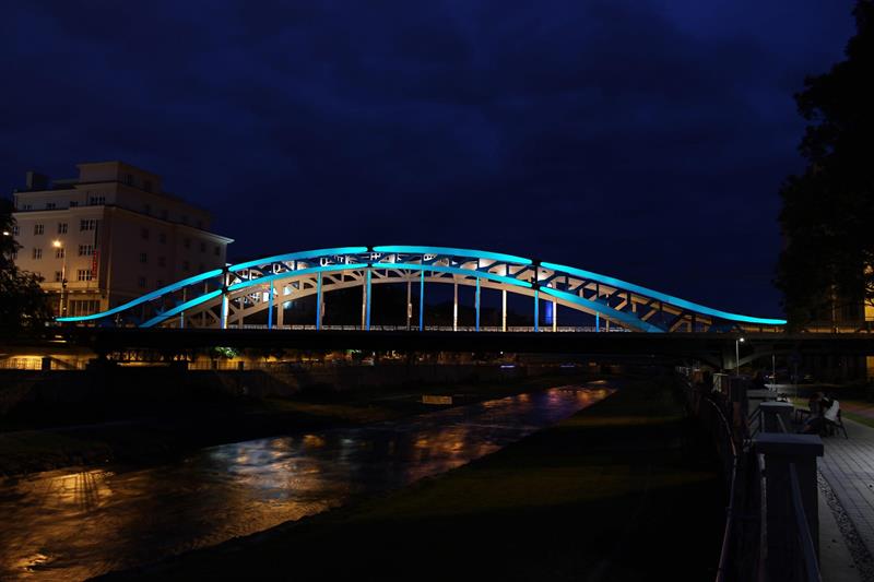 Most nasvícený ostravskou modrou.