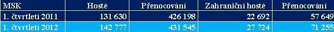 Počet hostů, a to i těch, kteří přenocovali, vzrostl v prvním čtvrtletí letošního roku nejen v měřítku celé České republiky, ale i Moravskoslezského kraje a turistické oblasti Ostravsko. Z ostravských atraktivit se výraznému růstu návštěvnosti těší Galerie výtvarného umění v Ostravě, jejíž expozice si během prvních třech měsíců roku 2012 prohlédlo o 11 500 návštěvníků více než ve stejném období loňského roku (celkem 29 700 návštěvníků).