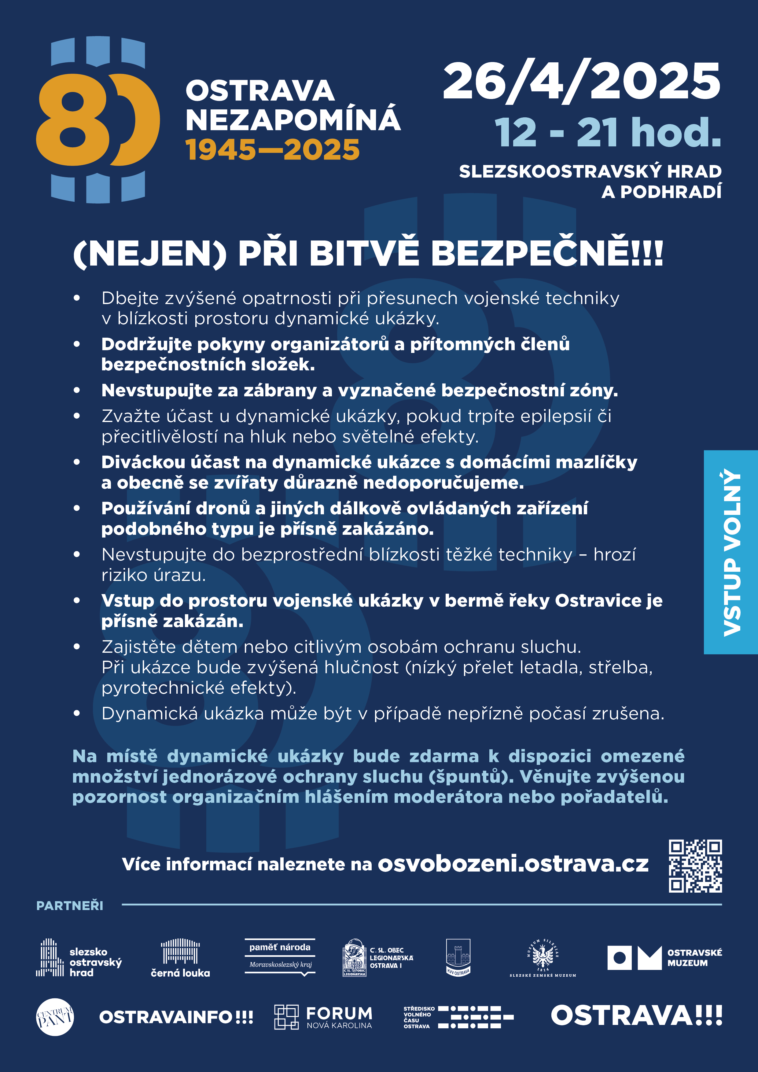 Oslavy 80. výročí osvobození jsou velkou veřejnou akcí, kde je očekávána přítomnost značného množství lidí, navíc zde dojde k rekonstrukci válečných bojů za použití těžké techniky a pyrotechniky. Proto je nutné, aby všichni přítomní dbali své vlastní bezpečnosti, řídili se danými pravidly a drželi se v prostoru určeném k pohybu veřejnosti. Za respektování výše uvedeného děkujeme.