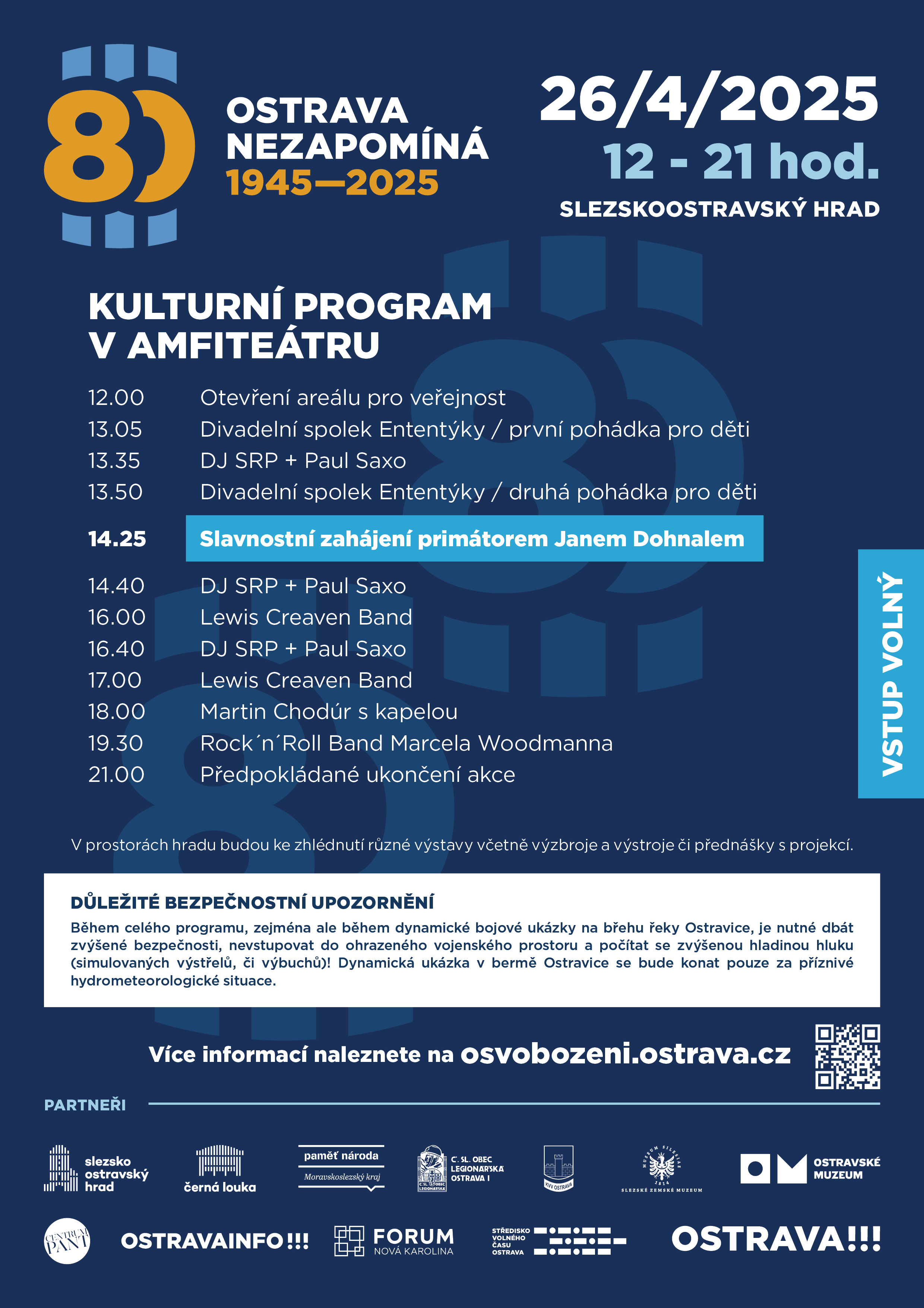 Koncem letošního dubna uplyne 80. let od Ostravsko-opavské operace, která vedla k osvobození Ostravy od německých okupantů. Jednalo se o jednu z posledních velkých bitev druhé světové války na evropském kontinentě. K tomuto významnému dějinnému jubileu připravilo město Ostrava, spolu s krajským vojenským velitelstvím, kluby vojenské historie a dalšími partnery na sobotu 26. 4. 2025 slavnostní program se širokým záběrem aktivit pro malé i velké.