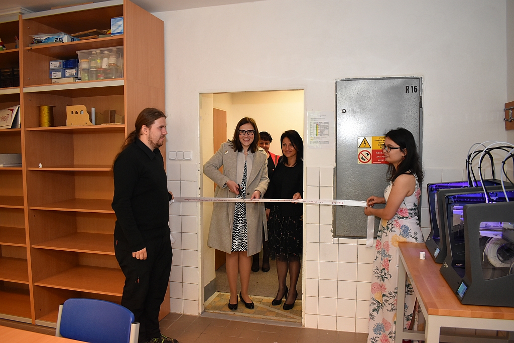 Náměstkyně primátora Andrea Hoffmannová stříhá pásku a otevírá novou učebnu.
