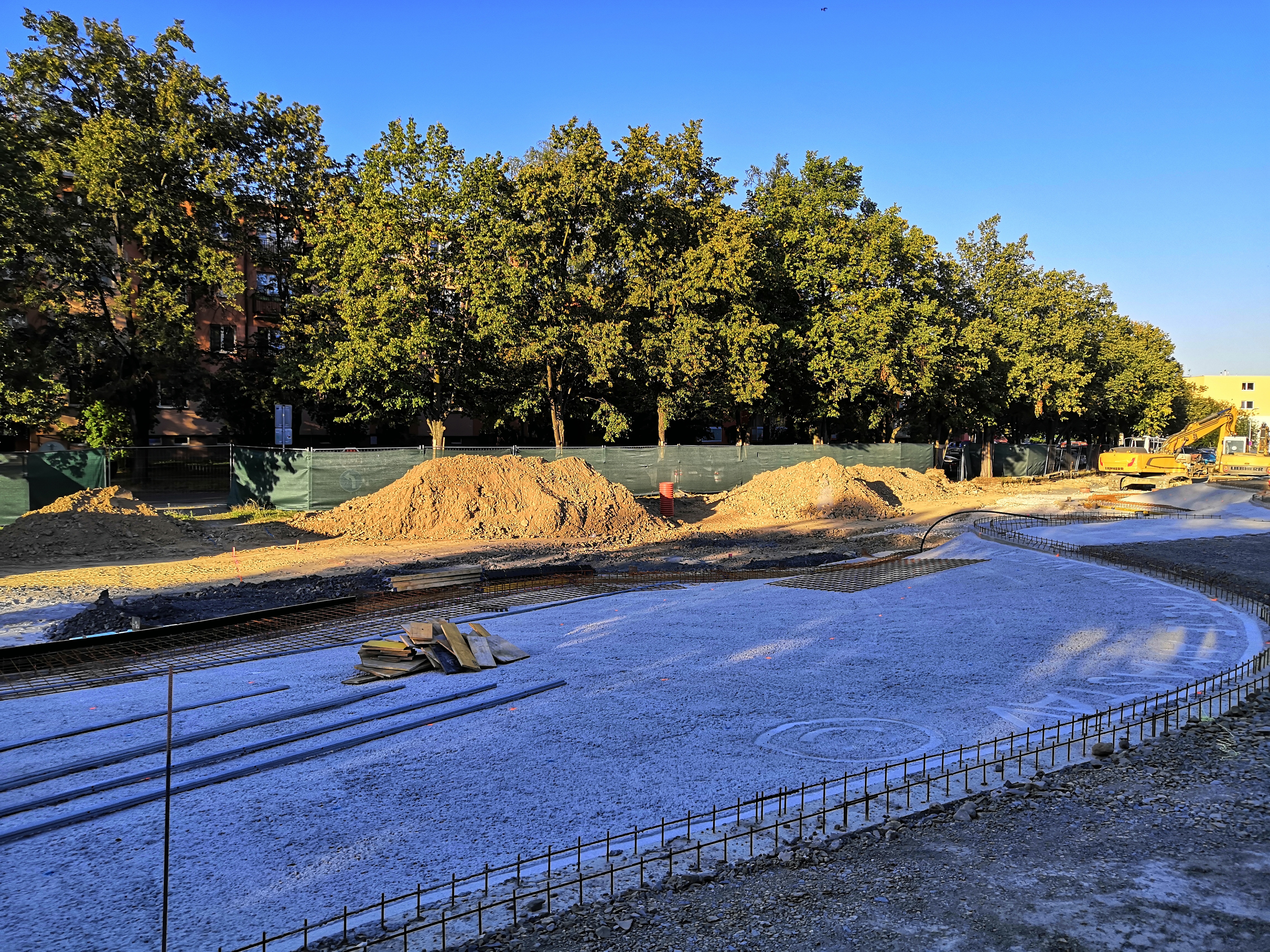 K dokončení tedy zbývá začít po vyztužení s postupnou betonáží jednotlivých ploch. Ty budou rozděleny do jednotlivých výškových úrovní, přesněji řečeno dilatačních celků. Nejdříve bude provedena horní deska, následně po provedení reliéfního obloukového bednění postupná náročná betonáž jednotlivých stupňů schodiště. Na tento postup naváže rozšíření parkoviště, budování prostoru malé vodní plochy – kaluže, do které bude převedena voda z vodního prvku a následně betonáže spodní plochy kolem vodního prvku a návazností na okolní plochy.
