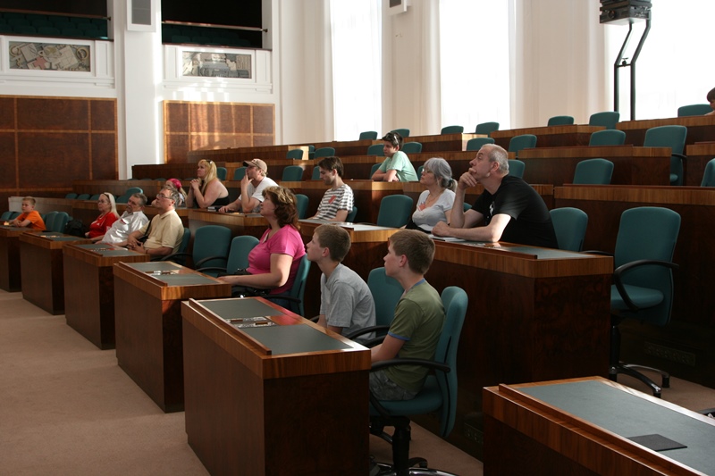 Návštěvníci radnice v lavicích městských zastupitelů.