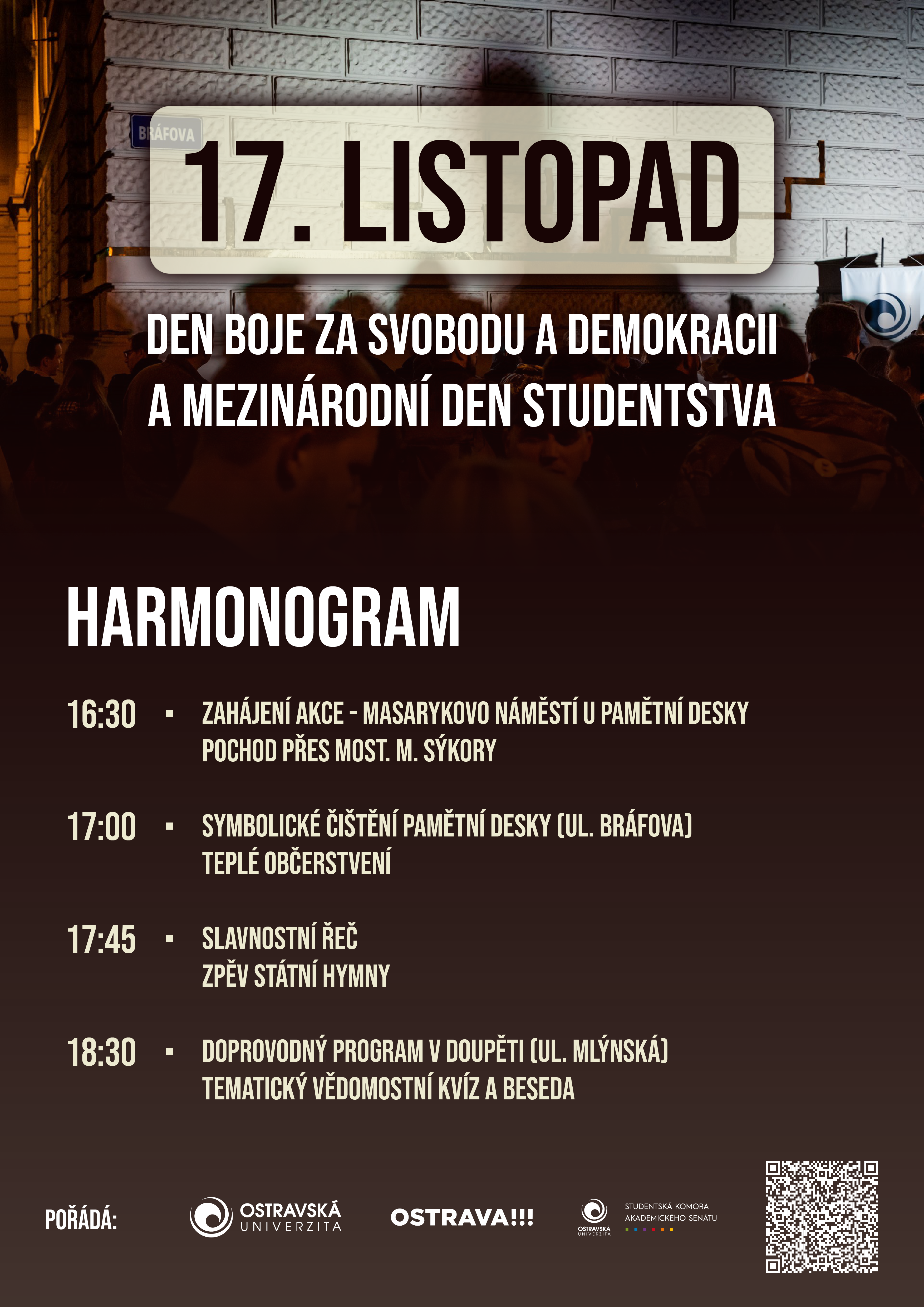 Studentští senátoři Ostravské univerzity ve spolupráci s městem Ostrava a Ostravskou univerzitou pořádají tradiční setkání k výročí Dne boje za svobodu a demokracii. V pátek 17. listopadu se studenti shromáždí na Masarykově náměstí, aby připomněli přelomové protestní akce konané v české historii.