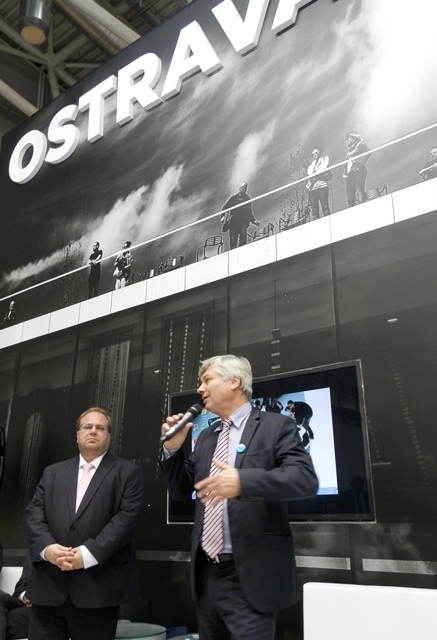 Primátor Petr Kajnar při prezentaci na stánku pro potenciální investory. Vedle něj hejtman Moravskoslezského kraje Miroslav Novák.