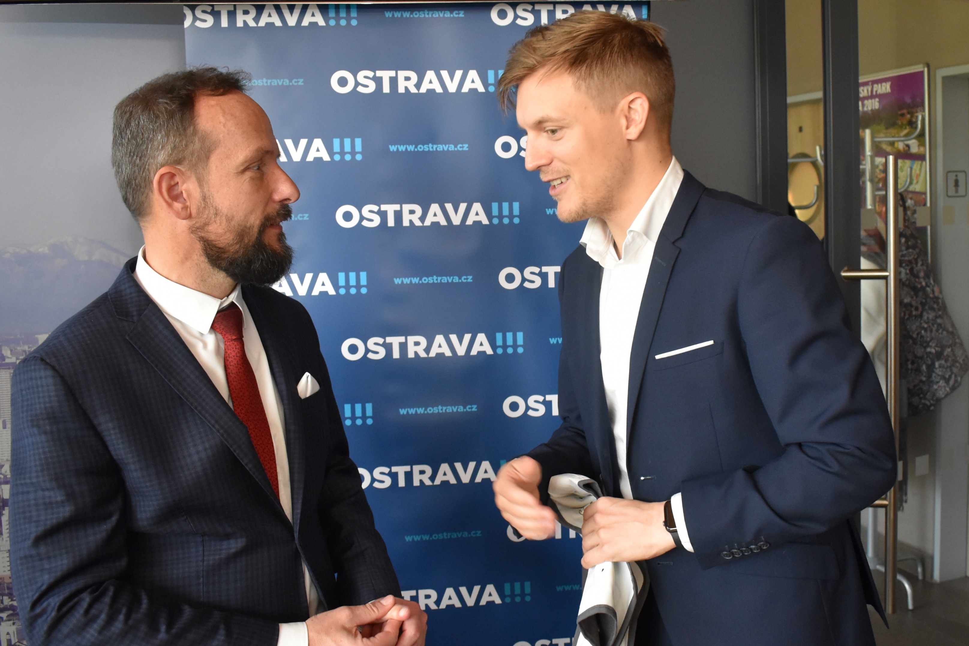 Tomáš Verner ukazuje primátoru Tomáši Macurovi chladicí vestu.