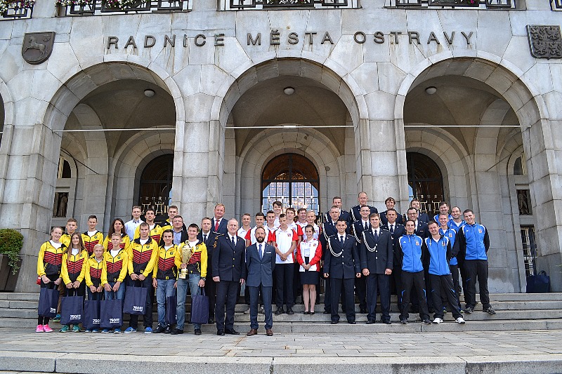 Společný snímek všech úspěšných hasičů před Novou radnicí.
