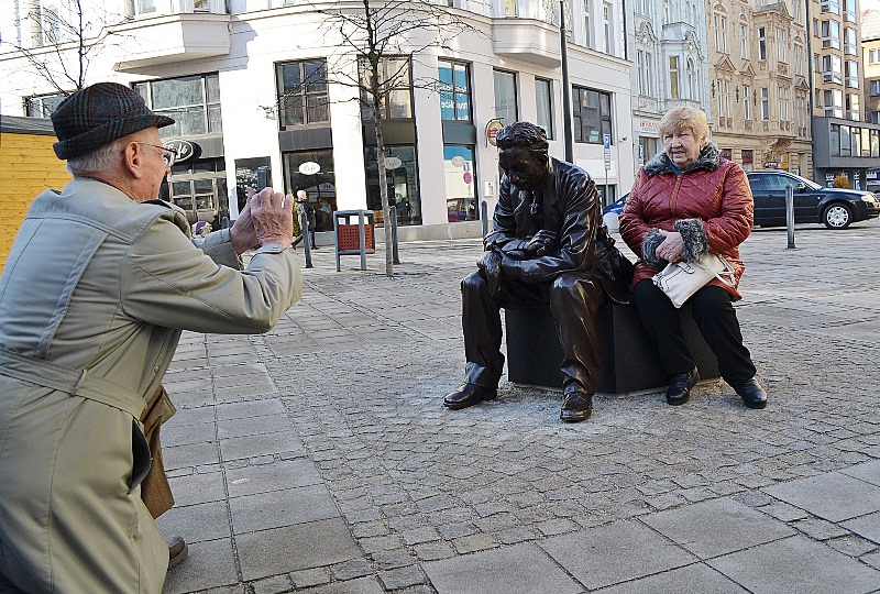 Lidé se rádi fotí u sochy skladatele.