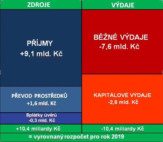 Rozpočet města na rok 2019, který schválili zastupitelé na svém zasedání 12. prosince, tvoří celkové příjmy ve výši 9,072 miliardy korun, což je o 738 milionů korun více než vloni. Do zdrojů pro rok 2019 je započten také převod prostředků z roku 2018 ve výši 1,63 miliardy korun, který je určen převážně na investice, zapojení Fondu životního prostředí ve výši 6 milionů korun a splátky úvěrů (snížení o 301 milionů korun). Dohromady se jedná o 10,406 miliardy korun. Celkové výdaje ve výši 10,406 miliardy korun pokryjí nejen běžné výdaje města, snížení dluhu o 0,3 miliardy korun, ale jsou v nich také zahrnuty 2,8 miliardy korun na investice.