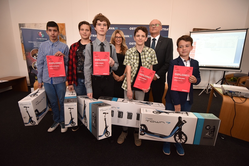 Vítězové ceny Sympatie ze ZŠ v Hrabová s náměstky primátora Kateřinou Šebestovou a Vladimírem Cigánkem.