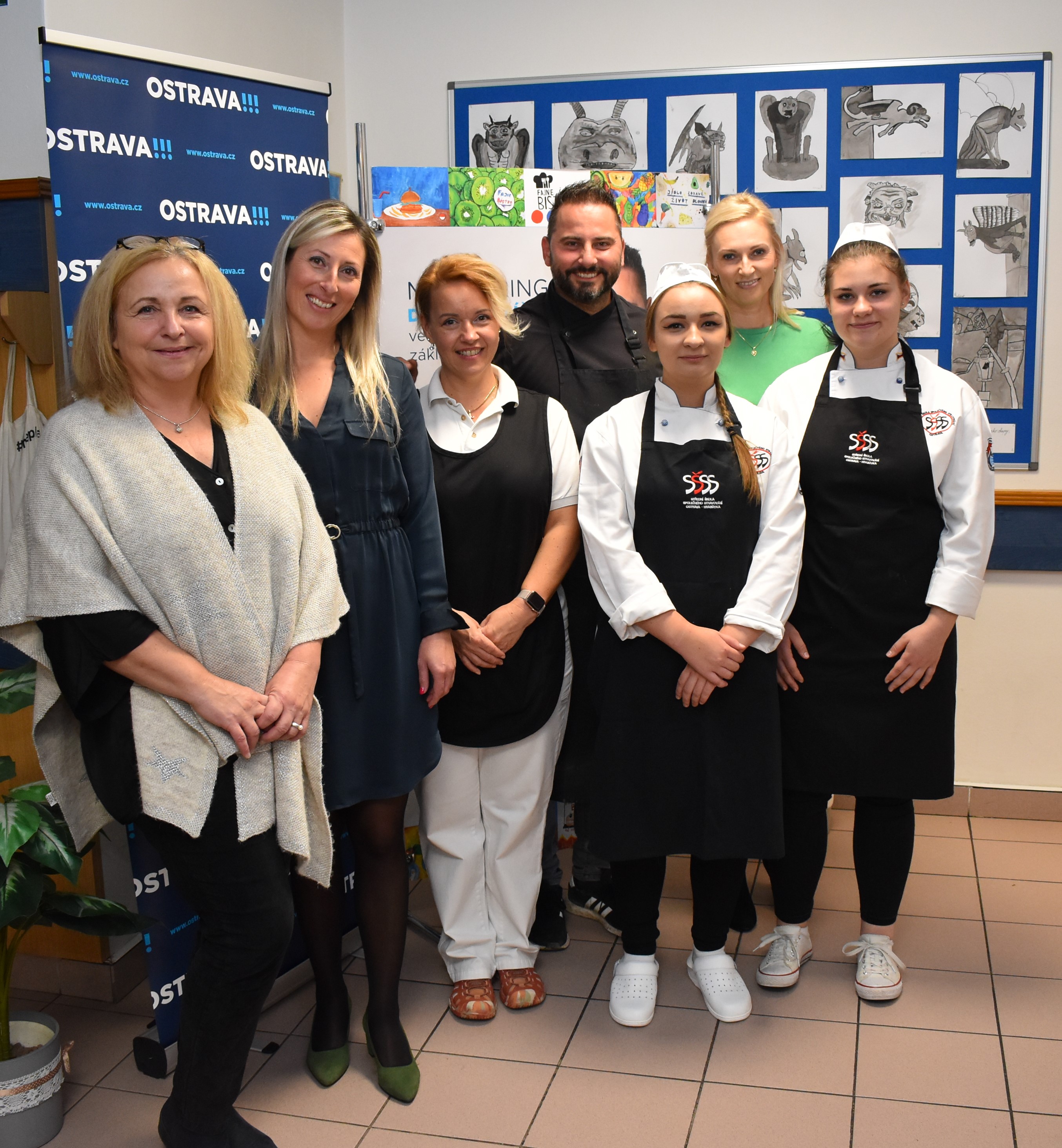 Kolektiv kuchařek školní jídelny tradičně doplnili žáci Střední školy společného stravování, Krakovská ul 1095/33, Ostrava-Hrabůvka, příspěvková organizace – oboru kuchař s učitelkou odborného výcviku Bc. Janou Tůmovou.