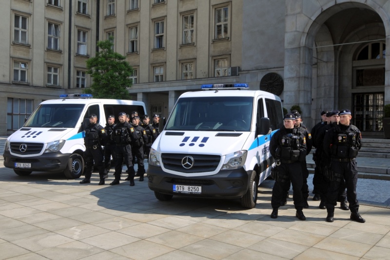 Příslušníci pořádkového oddílu MPO u svých nových vozidel.