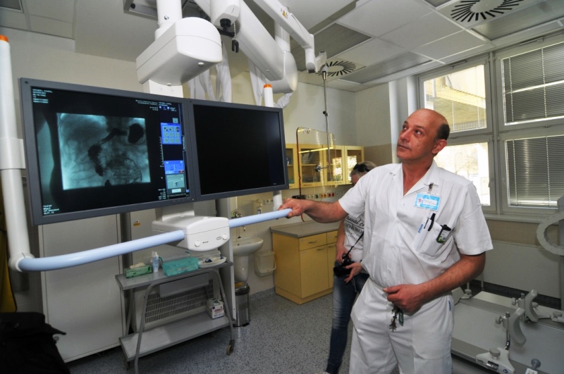 Asistent Marek Novák u monitorů angiografického RTG přístroje.