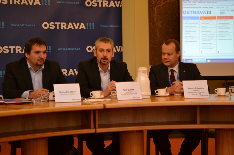 Zleva náměstek primátora M. Štěpánek, prezident České florbalové unie Filip Šuman a prezident Mezinárodní florbalové federaceTomas Eriksson.