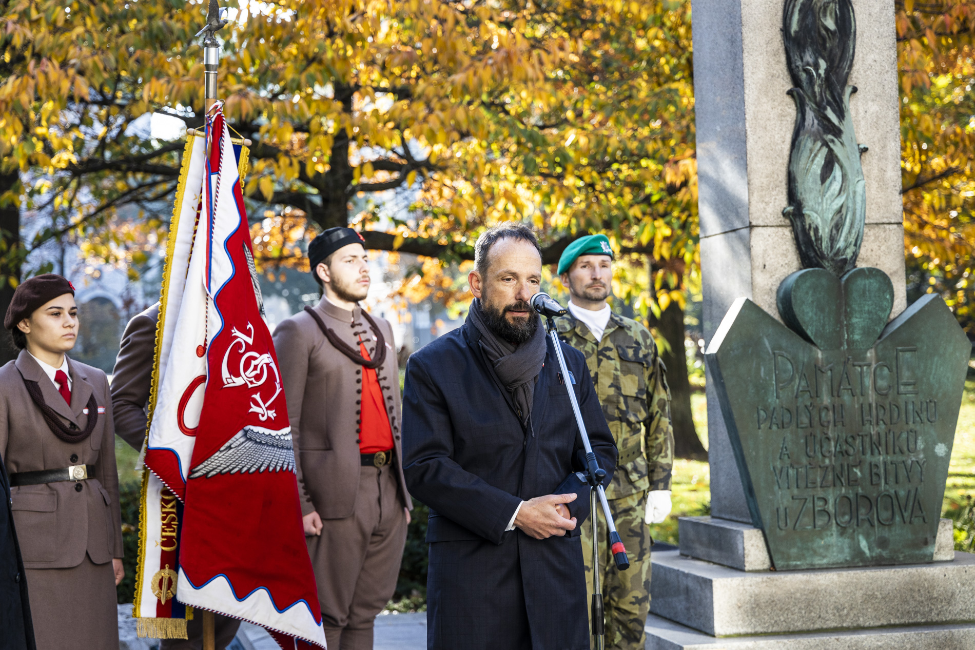 Samotné oslavy začaly v 10 hodin v Husově sadu, před památníkem bitvy u Zborova. Za účasti hejtmana Ivo Vondráka, primátora Tomáše Macury, jakož i zástupců bezpečnostních složek a řady spolků a institucí, zde došlo k položení věnců a květin. Tomáš Macura ve svém projevu zmínil také aktuální problémy: „Svoboda, samostatnost a na druhé straně zodpovědnost jsou dvě strany jedné mince. I dnes jsou státy a je plno lidí, kteří mají plná ústa řečí o své vlastní svobodě, o tom, že oni jsou pány svého osudu a mohou o sobě rozhodovat, aniž se ohlížejí na práva svých sousedů, svých blízkých, na osud planety a podobně.“