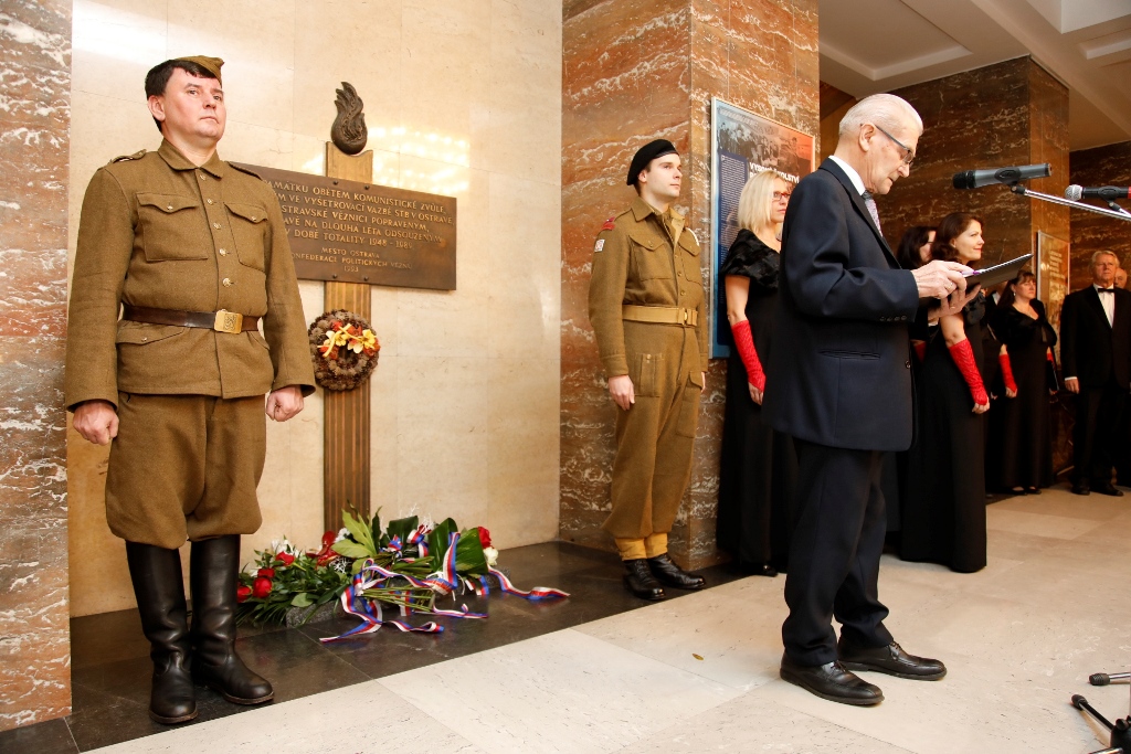 Leo Žídek hovoří u pamětní desky ve foyer Nové radnice.