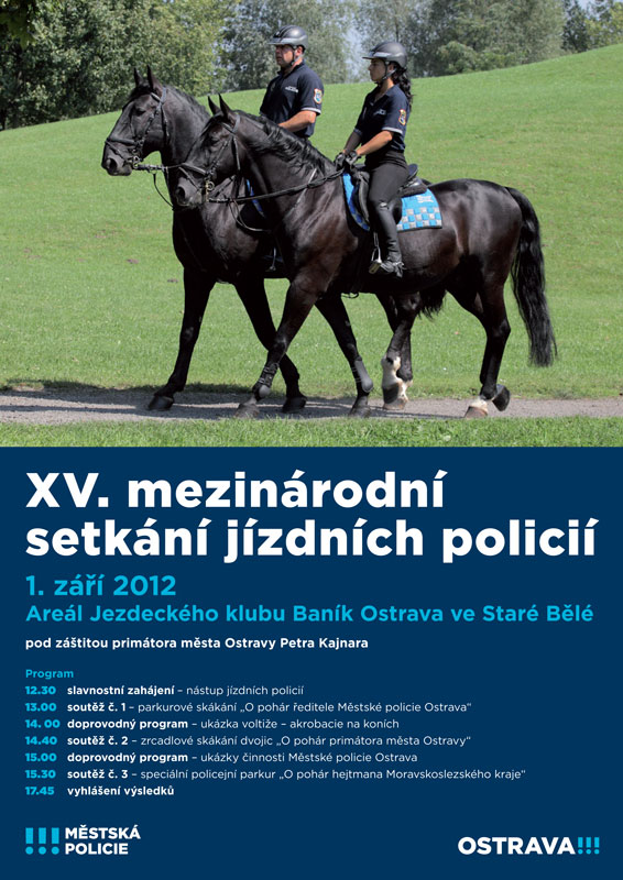 V areálu jezdeckého klubu TJ Baník Ostrava ve Staré Bělé se 1. září uskuteční od 12.30 hod XV. ročník Mezinárodního setkání jízdních policií. Zástupci jízdních policií z celé České republiky i ze zahraničí si zde změří své síly, předvedou se svými čtyřnohými svěřenci dovednosti a umění obstát ve všech náročných situacích, kterým čelí při výkonu služby, a vymění si navzájem cenné zkušenosti. Akce se uskuteční pod záštitou primátora města Ostravy Petra Kajnara.