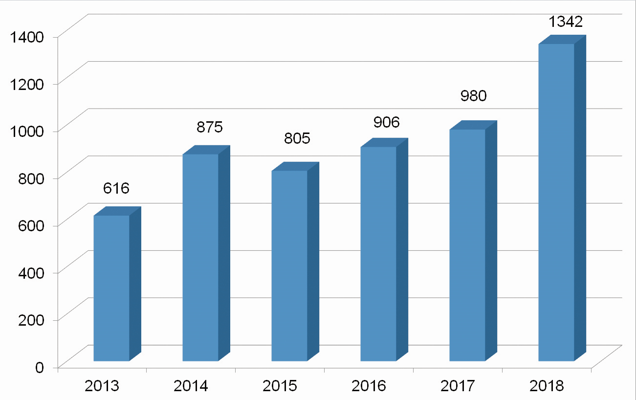 Nárůst dotací městským obvodům v letech 2013–2018 v mil. Kč