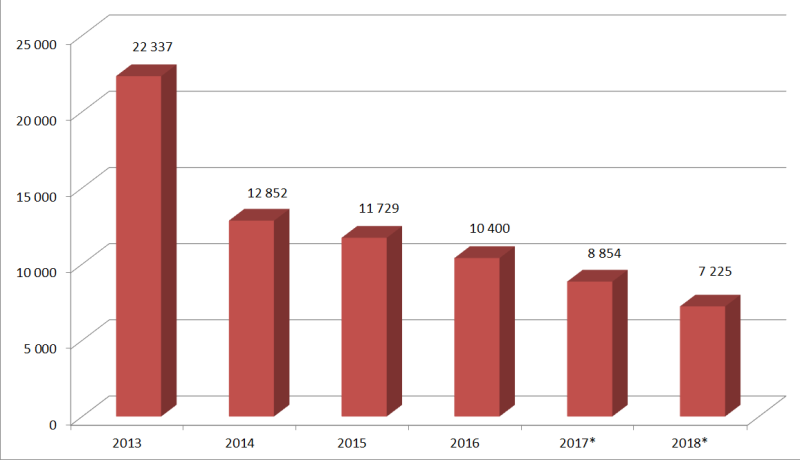 Pokles zadluženosti na 1 obyvatele v letech 2013 až 2018 v Kč