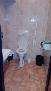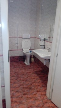 V suterénu, v návaznosti na zádveří vedlejšího vstupu do budovy, se nachází samostatná částečně upravená toaleta (dveře šířky 80 cm otvíratelné ven; práh 2,5 cm, kabina šířky 137 cm, hloubky 147 cm, výška záchodového prkénka 53 cm). Přístup k míse z pohledu od vstupu do kabiny je zprava (šířka 60 cm). V kabině chybí háček na oděvy a nouzové signalizační zařízení. Na dveřích chybí označení, včetně piktogramu vozíku a madlo. U záchodové mísy chybí levé madlo. Otevření toalety zajistí strážní služba.