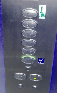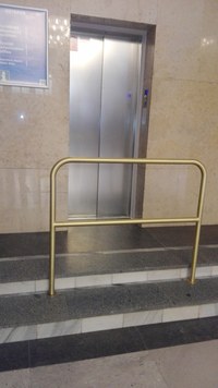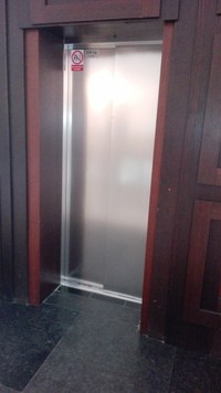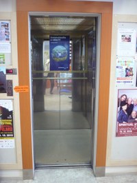 Pozor: v 1. patře se při výjezdu nachází dva schody opatřené zábradlím. Před schody není potřebná manipulační plocha a hrozí pád. Upozornění se nachází na ovládacím panelu vevnitř výtahové kabiny (přeškrtnutý piktogram vozíku).