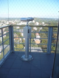 Výstupní plocha na věži z výtahu do místnosti šířka 260 cm, hloubka 134 cm. Výtahové dveře a dveře umožňující vstup na venkovní ochoz nejsou v ose. Venkovní dveře mají 80 cm, průjezdná šířka 79 cm. Ve dveřích osazen vysoký práh (výška 4 cm). Ochoz má šíři 145 cm a vede kolem celé věže. Prostor je v některých rozích zúžen o dalekohledy, průjezdná šíře 80 cm.