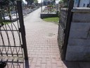 Hlavní vstup je zajištěn dvoukřídlou bránou, umožňující vjezd vozidel údržby. Vedle ní je umístěna menší branka pro pěší, která má průjezdnou šířku 92 cm. Přístupová komunikace je před i za hlavní branou tvořena zámkovou dlažbou. V jednom místě je mírně propadlá.