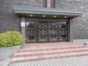 Hlavní vchod tvoří dvoukřídlé dveře (šířka hlavního křídla 101 cm, práh 2 cm), které se mechanicky otevírají směrem ven.