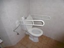 V přízemí se nachází samostatná částečně upravená toaleta (dveře šířky 83 cm otvíratelné ven, kabina šířky 150 cm, hloubky 450 cm, výška záchodového prkénka 42 cm). Mísa je osazena u levé boční stěny z pohledu od vstupu. Přístup k míse z pohledu od vstupu do kabiny je zprava dostatečný (390 cm). Mísa WC je opatřena dvěma sklopným madly (délka 80 cm, výška 93 cm a 103 cm, osová vzdálenost 52 cm). Kabina je volně dostupná, určena pro veřejnost a je označena piktogramem vozíku. Dveře do WC nejsou opatřeny madlem.