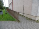Ze strany parkoviště se před bočním vstupem nachází přímá jednoramenná rampa (sklon 8 - 10 %, šířka 185 cm, délka 745 cm, průjezdná šířka 141 cm) s povrchem zámkové dlažby. Rampa je z jedné strany opatřena zábradlím. Manipulační prostor pod i nad rampou je dostatečný. Jednokřídlé dveře vedlejšího vstupu se otevírají mechanicky dovnitř (průjezdná šířka 93 cm, práh 1 cm). Dveře jsou opatřeny zavíracím mechanismem (BRANO) a nacházejí se ve výklenku (šířka 100 cm, hloubka 40 cm). Zvonková signalizace se nachází vlevo od dveří ve výklenku (ve výšce 116 cm).