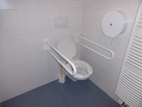 V 1. patře se nachází přístupná toaleta (dveře šířky 80 cm otvíratelné ven, kabina šířky 235 cm, hloubky 154 cm, výška záchodového prkénka 54 cm). Přístup k míse je dostatečný (174 cm). Mísa WC je opatřena jedním pevným madlem a jedním sklopným madlem (délka 83 cm, výška 86 cm, osová vzdálenost 60 cm). Dveře do kabiny WC jsou opatřeny madlem z obou stran (výška 88 cm). Kabina je volně dostupná a je označena piktogramem vozíku.