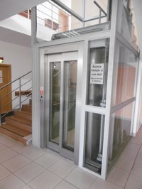 Hlavní výtah (automaticky otevíratelné dveře šířky 80 cm, kabina šířky 108 cm, hloubky 139 cm) je přístupný z chodby. Je vybaven madlem na boční stěně (ve výši 91 cm) a sklopným sedátkem (zmenší šířku kabiny na 104 cm). Ovladač na nástupních místech (ve výši max. 106 cm), ovladače uvnitř kabiny (ve výši max. 116 cm). Výtah spojuje 1. a 2. patro. Manipulační prostor před výtahem je dostatečný.